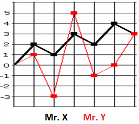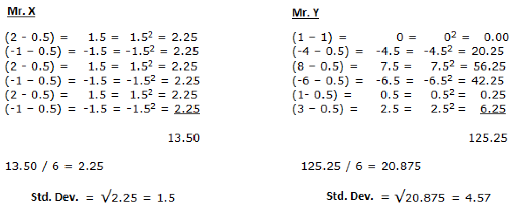 To understand the concept of volatility (standard deviation), let’s look at the example of two traders, Mr. X, and Mr. Y: Mr. X always wins 2 and loses 1, and after 6 trades, he wins a total of 3. In other words, he wins 0.5 per trade ((2 – 1 + 2 – 1 + 2 – 1 + 2 – 1) / 6). On the other hand, Mr. Y wins a total of 3 after 6 trades and his average per trade is 0.5 ((1 – 4 + 8 – 6 +1 + 3) / 6). On the surface, the return performance of both is the same, but the chart above clearly shows that Mr. X’s performance is less risky than Mr. Y’s performance as it is subject to much less volatility. Standard Deviation is used to see this difference. To find the standard deviation of the above styles, we first average the returns per trade, then subtract this average from the returns of each trade. These figures are then squared to eliminate negative values. Finally, the sum of the squares is divided by the number of trades to get the square root of the result.